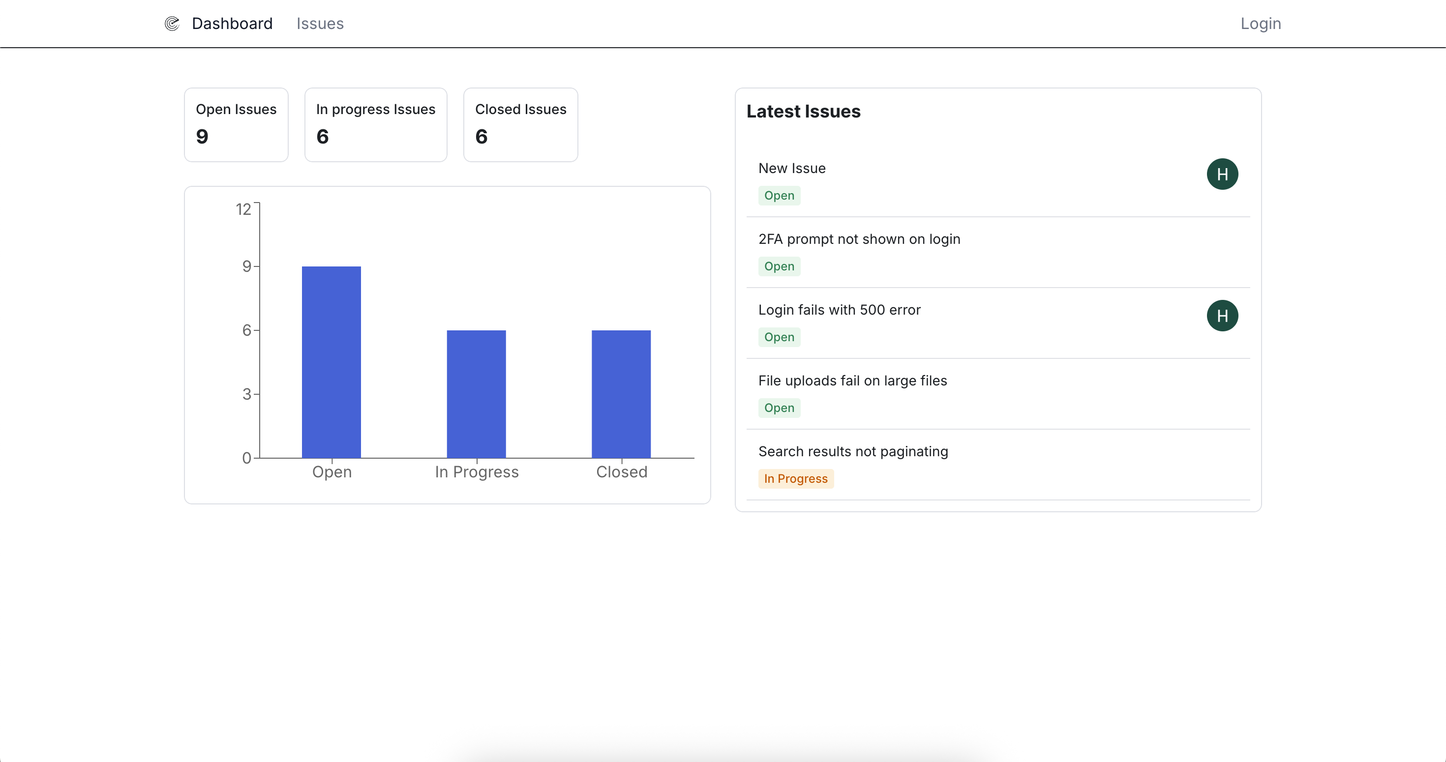 An issue tracking dashboard that displays real-time summaries, interactive charts, and a feed of recent activity.